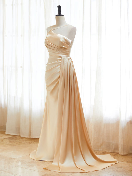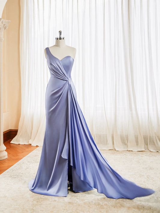 One Shoulder Prom Dresses 2025 Satin Mermaid Ruched Bridesmaid Dress with Side Train