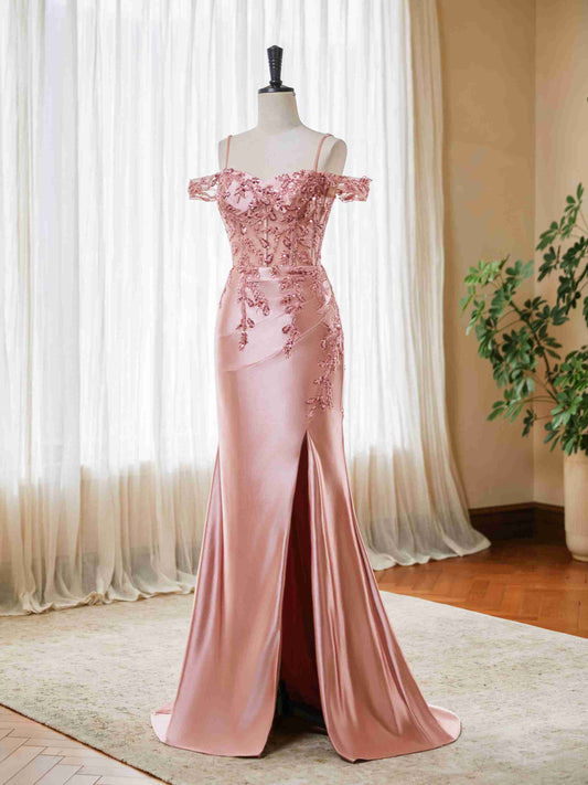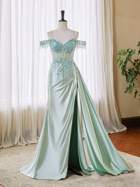 Off Shoulder Mermaid Prom Dresses Satin Corset Evening Gown Sequin Beaded Formal Dress with Slit