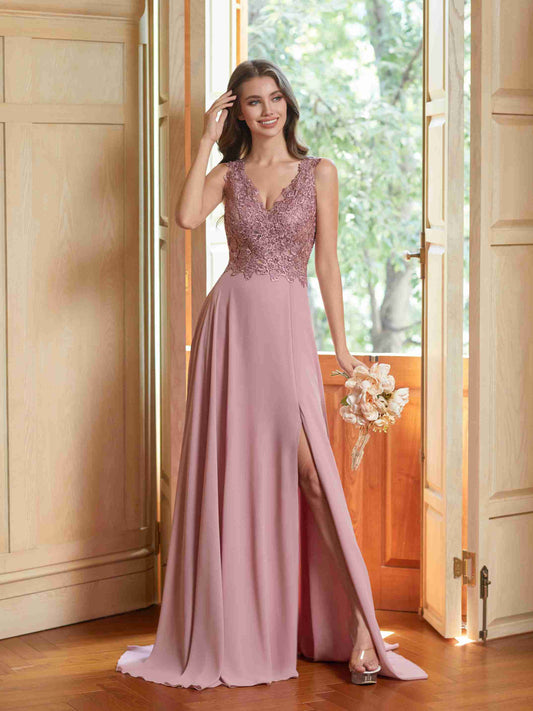 Lace Appliques Chiffon Bridesmaid Dresses 2025 Long Beaded Prom Dress A Line Formal Party Evening Gowns with Slit for Women
