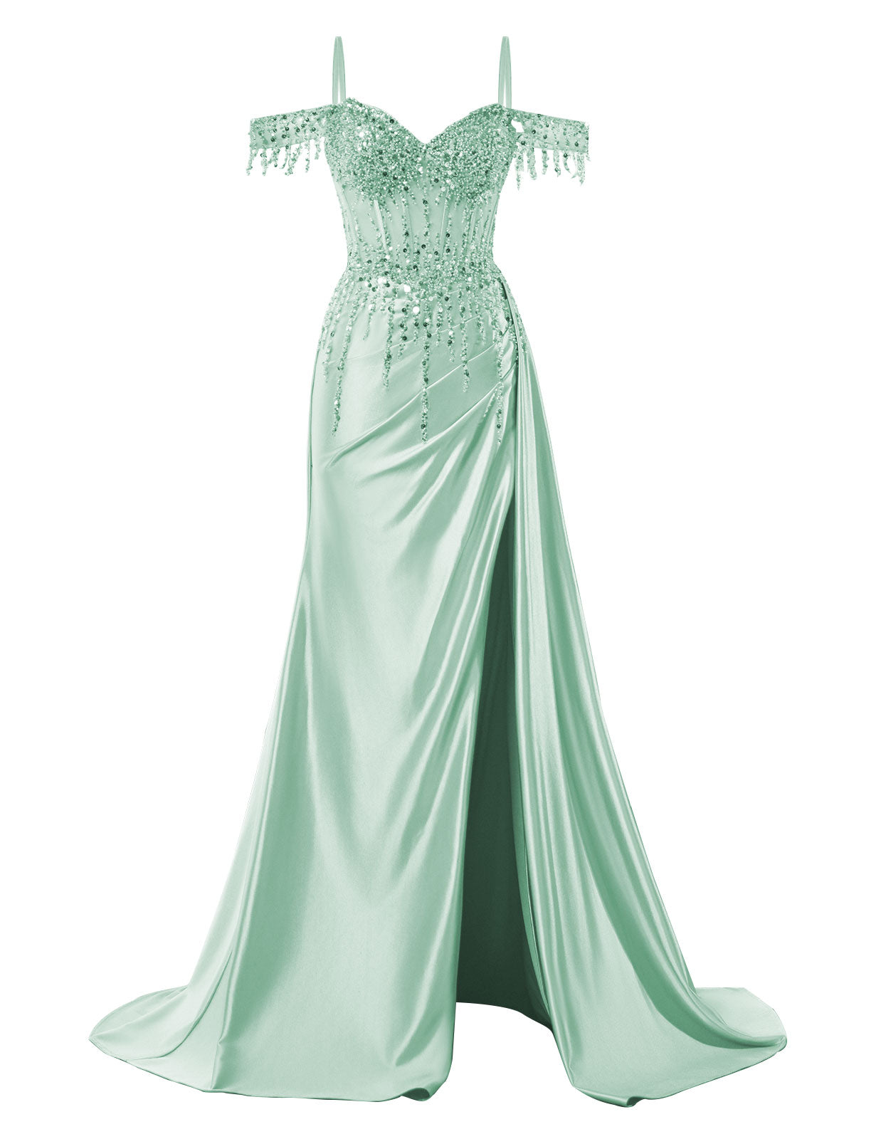 【Features】Off shoulder mermaid prom dresses, satin prom dresses 2025, corset evening gown with slit, sequin beaded formal dress with tail, long, corset, pleated,empire waist, floor length, bulit in bra, zipper back.