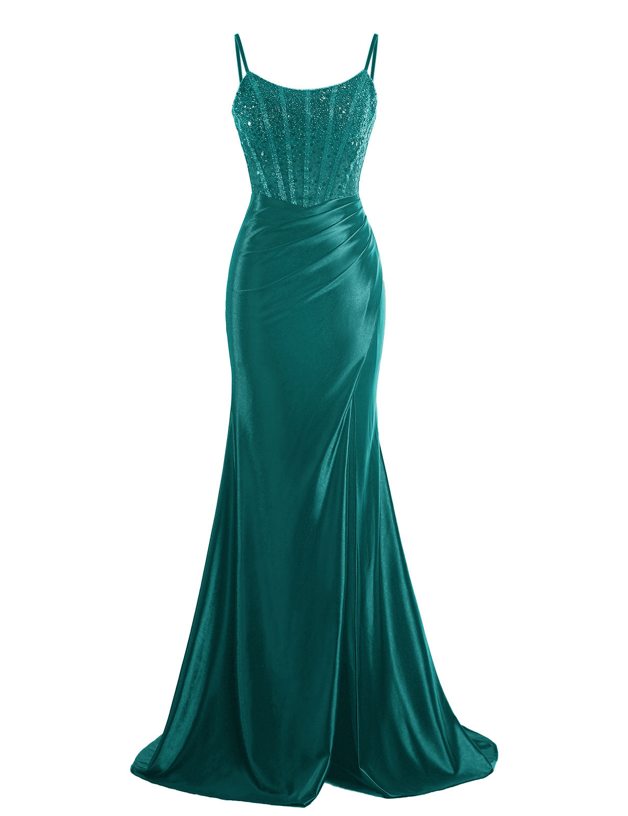Feature: Silk satin prom dresses, mermaid prom dresses, beaded prom dress, corset, spaghetti straps prom dress, lace applique, long, bodycon, backless, pleated/ruched, floor length, with slit, lace up back, plus size prom dress.